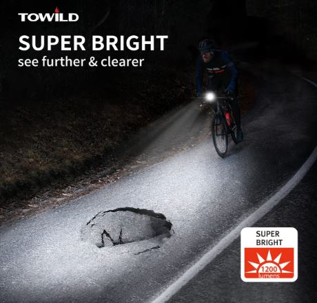 TOWILD CL1200 Światło rowerowe do jazdy nocą, kompatybilne z mocowaniem Garmin/GoPro, jasne światło rowerowe 1200 lumenów, bateria 4000 mAh, wodoodporne światło rowerowe dla osób dojeżdżających do pracy.