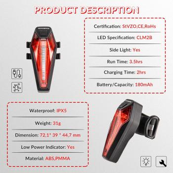 ROCKBROS Rowerowe światło tylne IPX5 z certyfikatem StVZO 20 lux