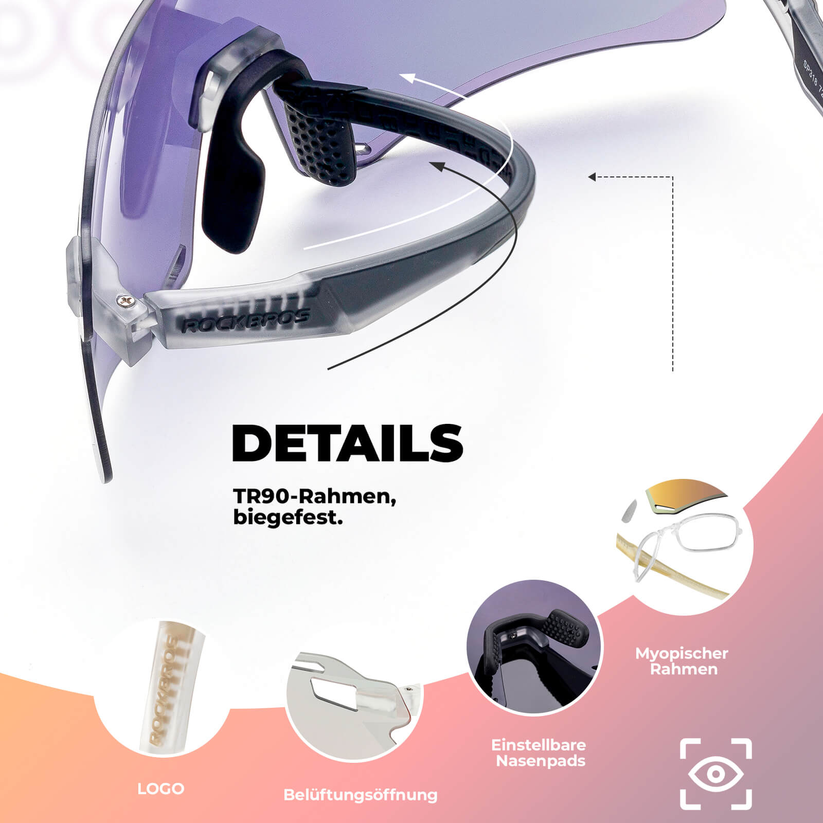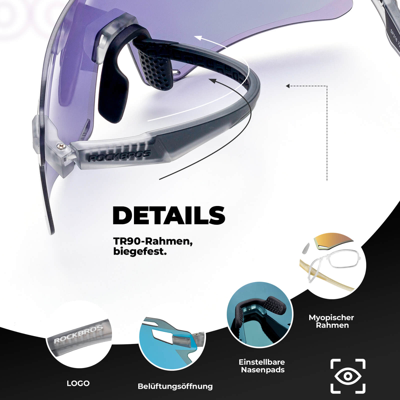 Wbudowana oprawka dla osób krótkowzrocznych: Eliminuje potrzebę jazdy na rowerze dla osób krótkowzrocznych. Wskazówki: Soczewki dla osób krótkowzrocznych nie są dołączone; należy je dokupić. Zalecane dla krótkowzroczności do 400 stopni i astygmatyzmu do 200 stopni.