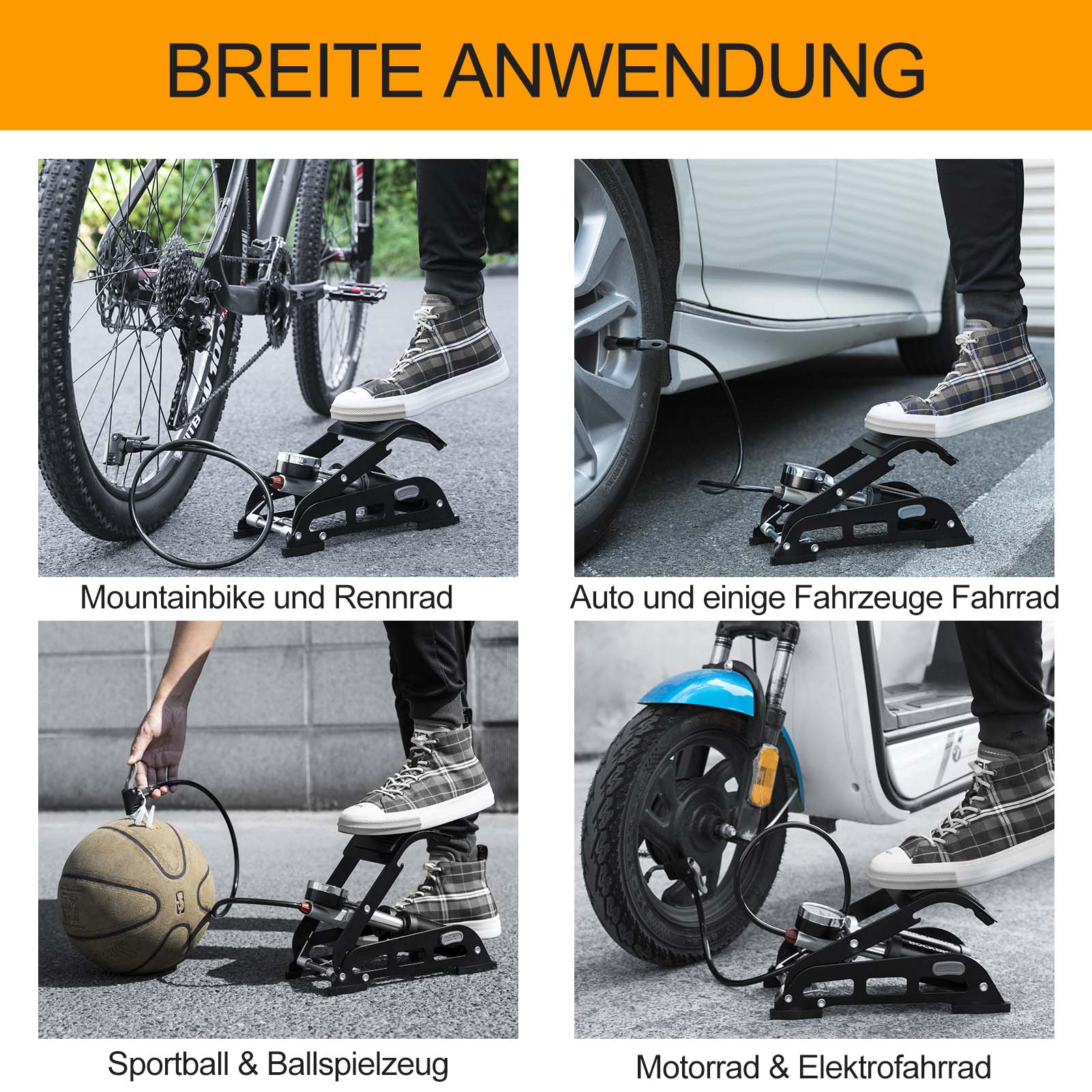 • Solidna konstrukcja: Odłączany gumowy wąż jest mrozoodporny i odporny na ciepło o długości około 30 cm. Szerszy pedał ma antypoślizgową konstrukcję, która zapobiega ślizganiu się pompki podczas pompowania.
