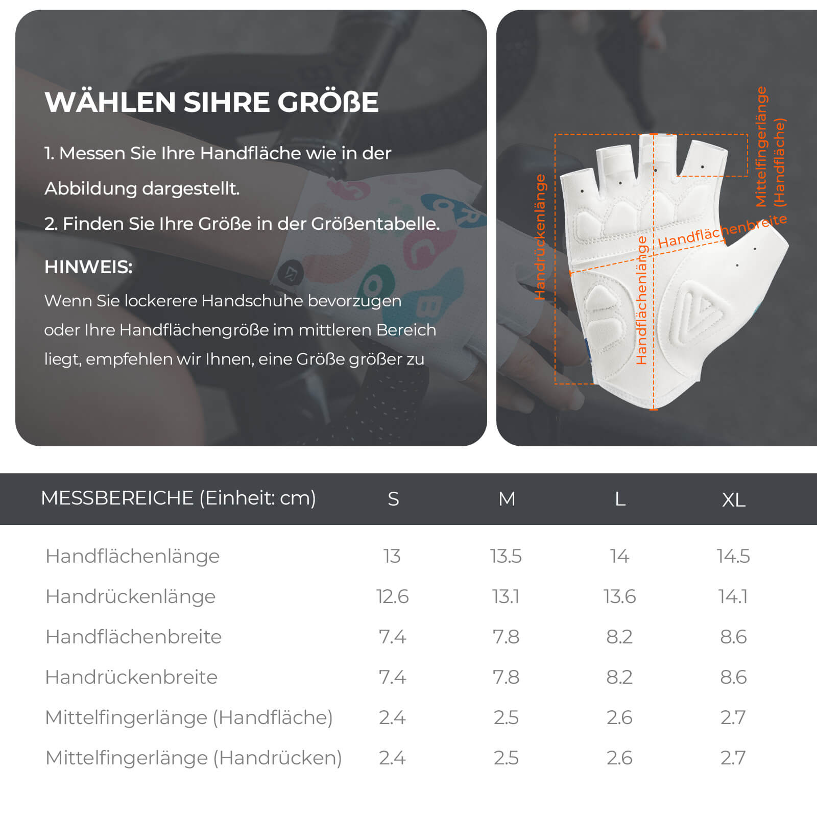 4. PRECYZYJNY DOBÓR ROZMIARU NA PODSTAWIE OBWODU DŁONI Przejrzysta tabela rozmiarów gwarantuje idealne dopasowanie poprzez pomiar dłoni. Wskazówka: W przypadku dłoni średniej wielkości wybierz rozmiar większy, aby uzyskać luźniejsze dopasowanie. 5. ODDYCHAJĄCE I BEZ SZWU, IDEALNIE WYKONUJĄCE SIĘ PRZEZ DŁUŻSZY CZAS Specjalny skład materiału gwarantuje optymalną cyrkulację powietrza. Bezszwowa konstrukcja eliminuje otarcia – idealne na wielogodzinne wyprawy.