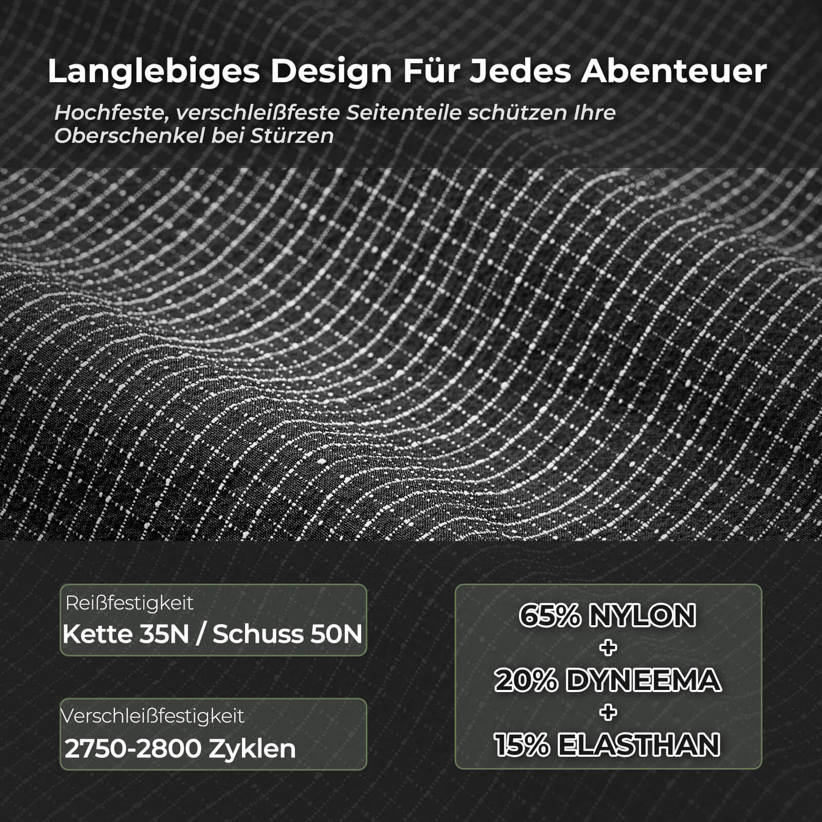 Specjalny materiał (65% nylon, 20% Dyneema, 15% elastan) na udach o doskonałej odporności na ścieranie (2750-2800 cykli).